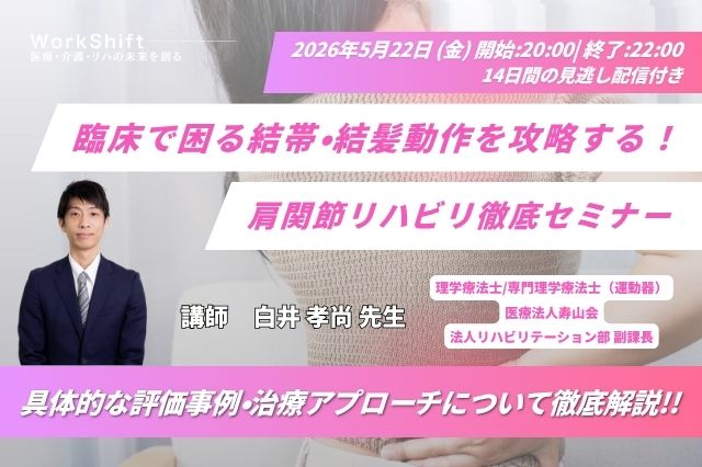 2026年5月22日(金)臨床で困る結帯・結髪動作を攻略する!肩関節リハビリ徹底セミナー(14日間の見逃し配信付き)