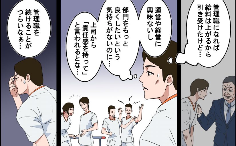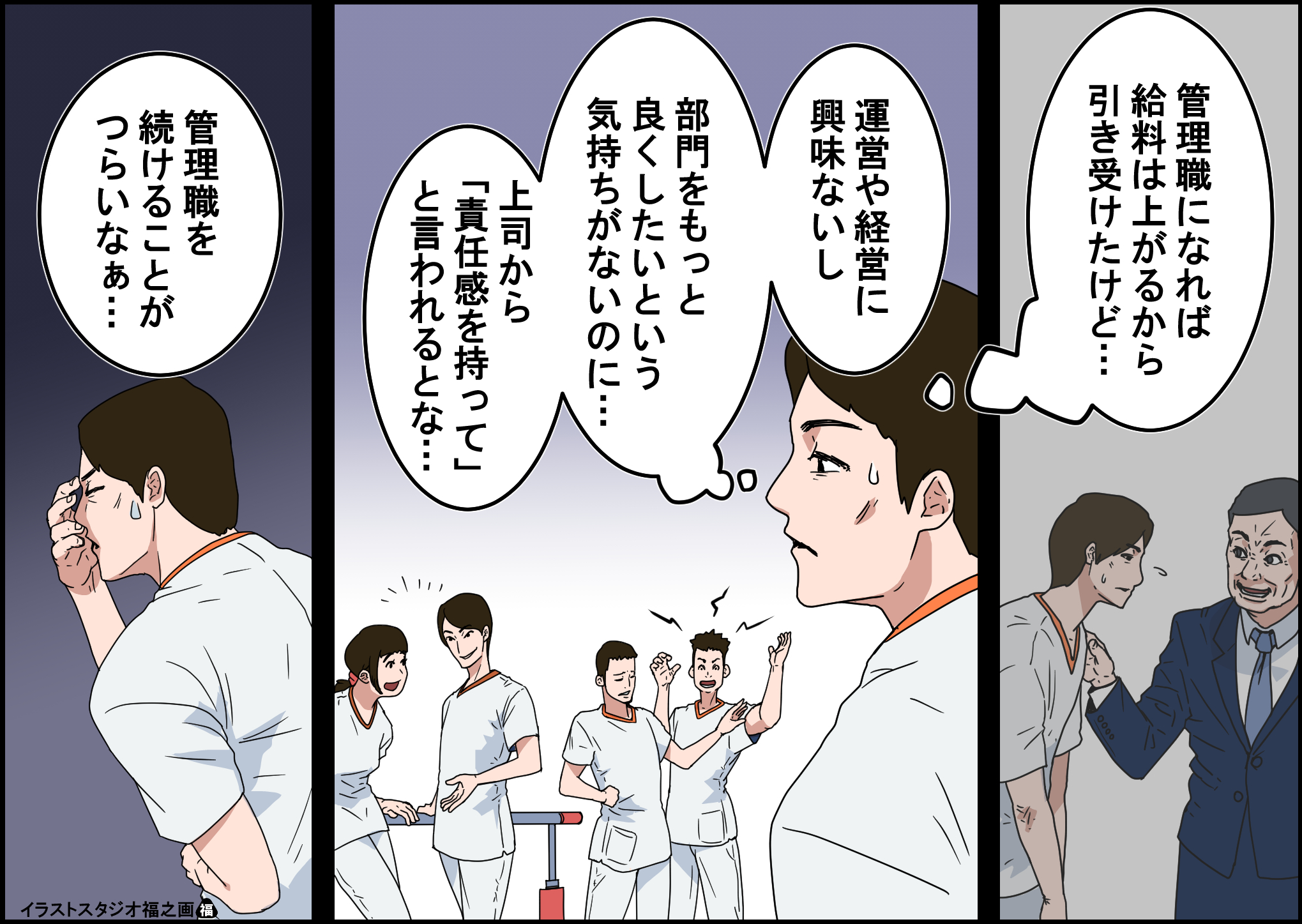 管理職を前向きに取り組む動機づけが乏しいので経営者や上司からの要求、組織内における人間関係の調整、リハビリテーション部門としての売り上げの確保などに強いストレスを感じるようになる。