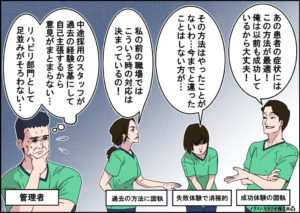 しかし、リハビリテーション部門の責任者や管理者が保身の気持ちを持てば持つほど、中途採用者への関りは少なくなり、組織内に問題が起こりやすくなる。