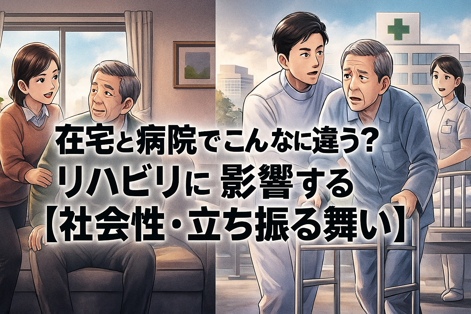 病院内、とくにリハビリテーション室では、セラピストや他の患者さんがいる中でリハビリを行うため、対象者には無意識に社会性が働き、特別な立ち振る舞いが引き出されることがあります。