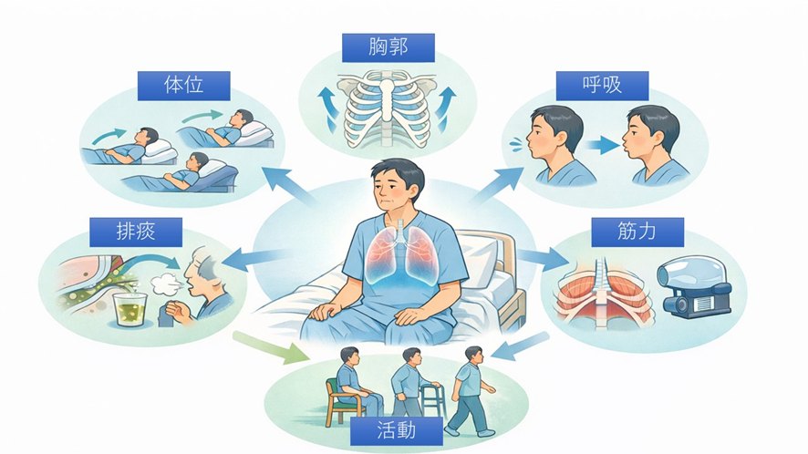 端座位、前傾位、側臥位、ベッドアップなどを用い、横隔膜の運動効率、FRC(機能的残気量)、胸郭の動きやすさを確保する。