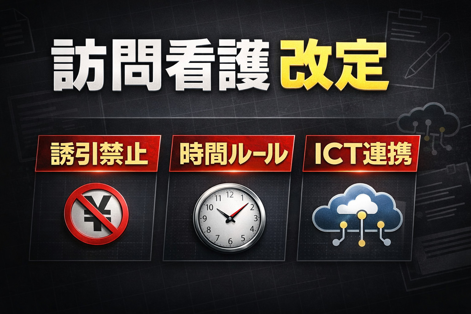 訪問看護の改定でまず押さえるべきは、運営ルールの明確化と、誘引・誘導の禁止の強化である。