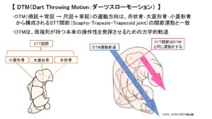 DTM(橈屈+背屈 → 尺屈+掌屈)の運動方向は、舟状骨‐大菱形骨‐小菱形骨から構成されるSTT関節(Scapho-Trapezio-Trapezoid joint)の関節運動と高い一致性を示すことが報告されています。