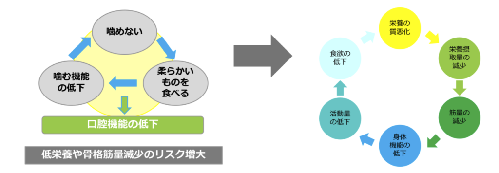 そうしたことが習慣化されると、図右に示すような低栄養から骨格筋量の減少、身体活動量の低下など負のループに陥ることになる。