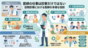 訪問診療における医師の役割は、診察、処方、検査指示だけではない。療養方針の決定、急変時の判断、入院の要否判定、看取りの説明、家族との合意形成、多職種への指示まで担う存在である。