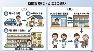 このように整理すると、(Ⅰ)は「外から訪問する訪問診療」、(Ⅱ)は「施設に併設された医療機関による入居者診療」と理解できる。