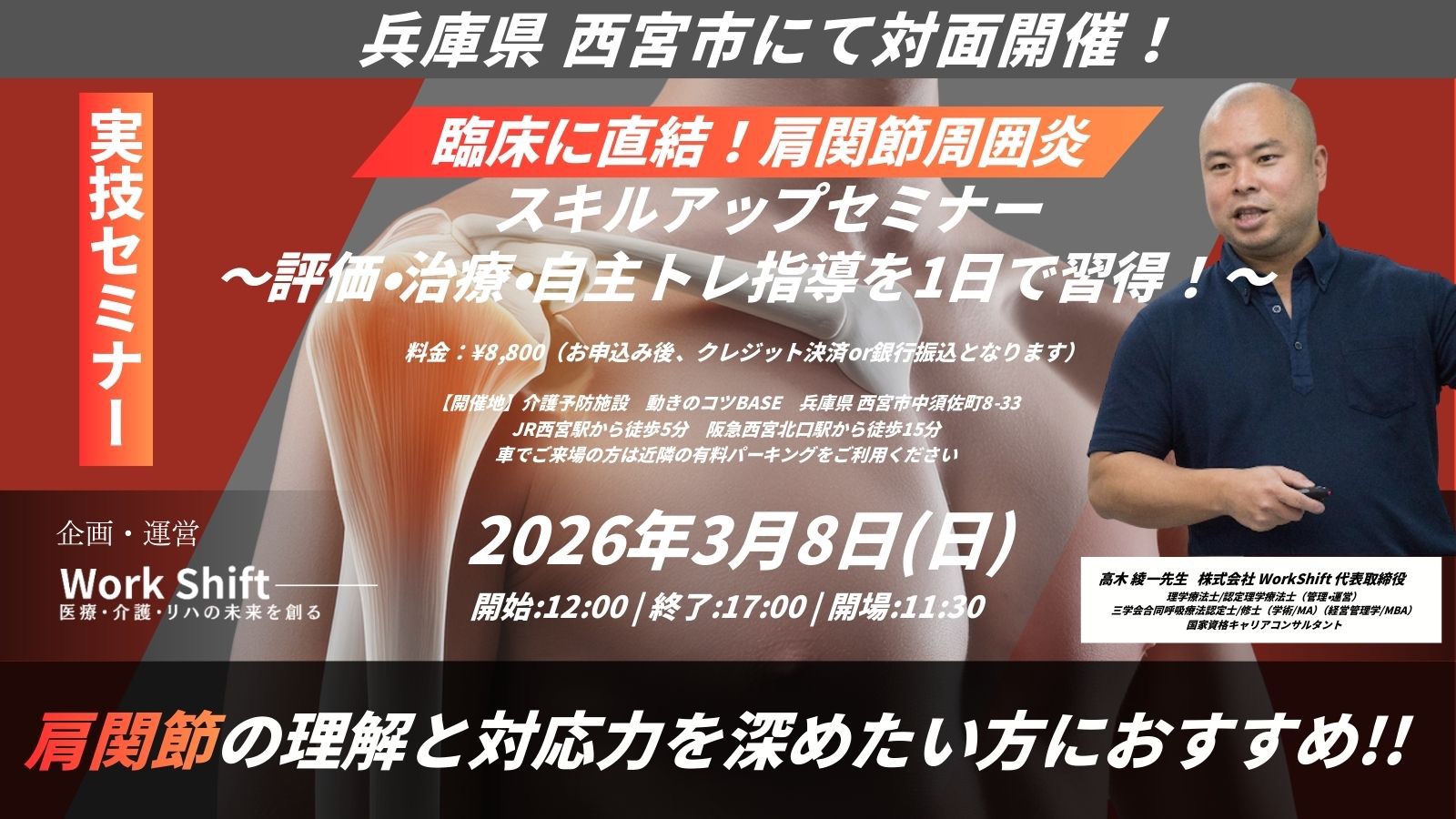2026年3月8日(日)実技セミナー 臨床に直結!肩関節周囲炎 スキルアップセミナー〜評価・治療・自主トレ指導を1日で習得!〜